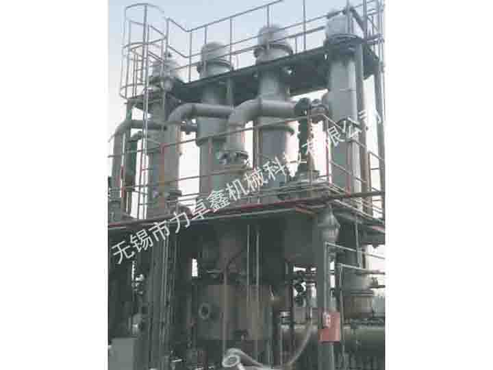 工作原理:四效降膜蒸發器需濃縮的料液由泵送入加熱管頂部,沿著加熱管內壁形成液膜向下流動。在這個過程中,由于管外的加熱,管內液膜開始沸騰并部分蒸發